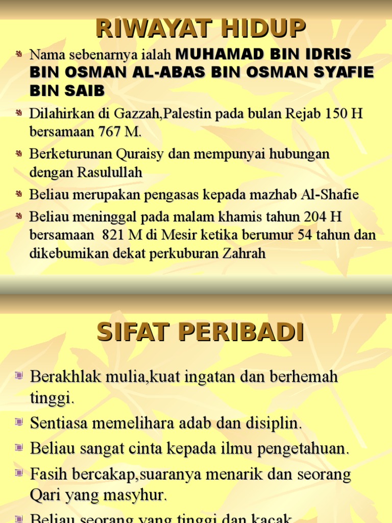 Yahya bin main berkata imam malik adalah bagaimana mungkin. TINGKATAN 4 SIRAH DAN TAMADUN ISLAM IMAM SYAFIE RAHIMAHULLAH RIWAYAT HIDUP DAN SIFAT PERIBADI KELEBIHAN IMAM SYAFIE Nama sebenarnya ialah Abu Abdullah Muhammad bin Idris bin Al-Abbas bin Usman bin Syafik b As-Saib Kuat ingatan Lahir di Ghazzah Palestin pada tahun 150 hijrah. BBeliau digelar As-Syafie sempena nama datuknya Syafie bin Saib.